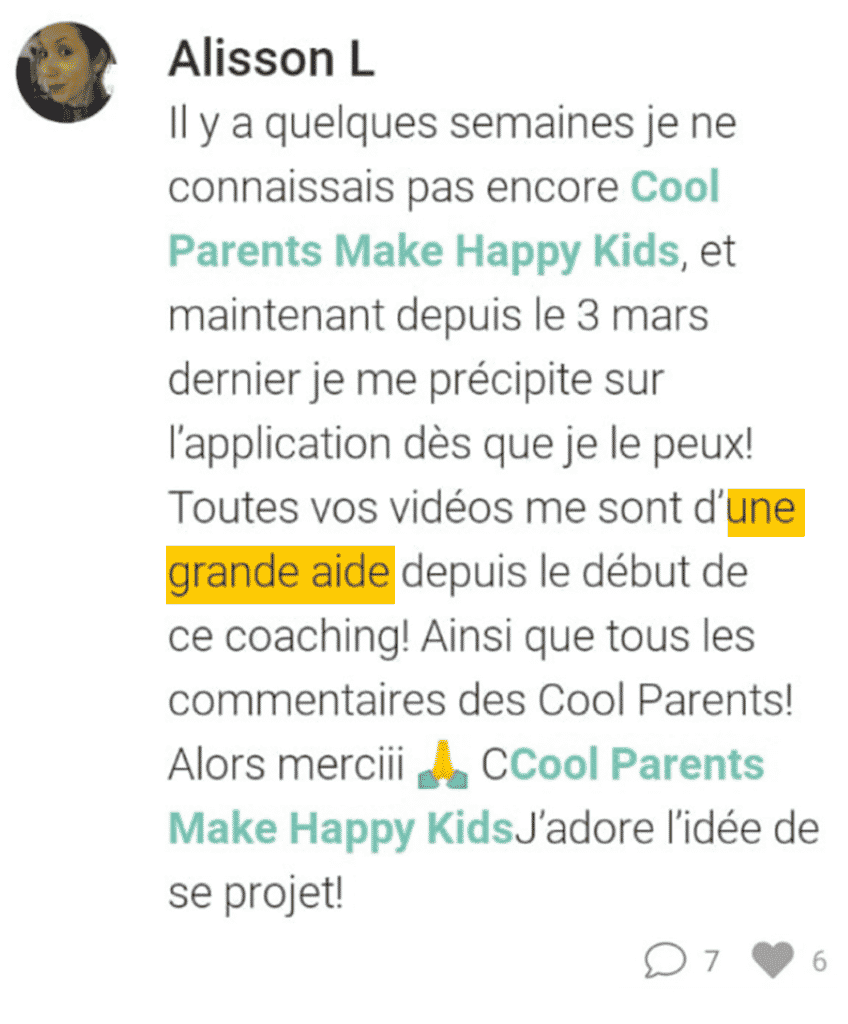 Chez Cool Parents Make Happy Kids, notre rêve était d’offrir un accompagnement de grande qualité, et qui ait un vrai impact dans le quotidien des parents, à un prix accessible à tous. En bref, que ce soit ton meilleur investissement : “impact positif sur mon quotidien” versus “coût”. Car avoir une atmosphère plus zen à la maison, moins s’énerver, créer plus de liens avec son/sa conjoint(e), ses enfants, “combien cela vaut” ?