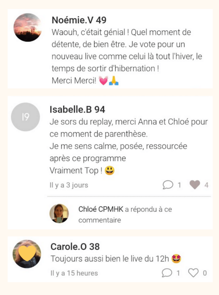 Cet atelier a lieu à l’heure du déjeuner, tu peux aussi le regarder en replay, mais c’est vrai qu’en live, il y a une super énergie de groupe, tous les participants tchatent ensemble, répondent ensemble aux questions, c’est vraiment très motivant ! Tu y accèdes via l’appli’, ou via un ordinateur.