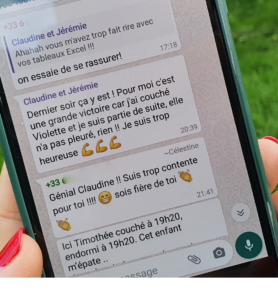 Au début, nos clients sont sceptiques et, finalement, ils adorent 🤗 ! Nous organisons des groupes WhatsApp avec maximum 4 autres familles qui suivent le coaching en même temps que vous, afin que vous puissiez échanger et vous soutenir mutuellement. Un vrai soutien pour que chacun ne se sente jamais seul !